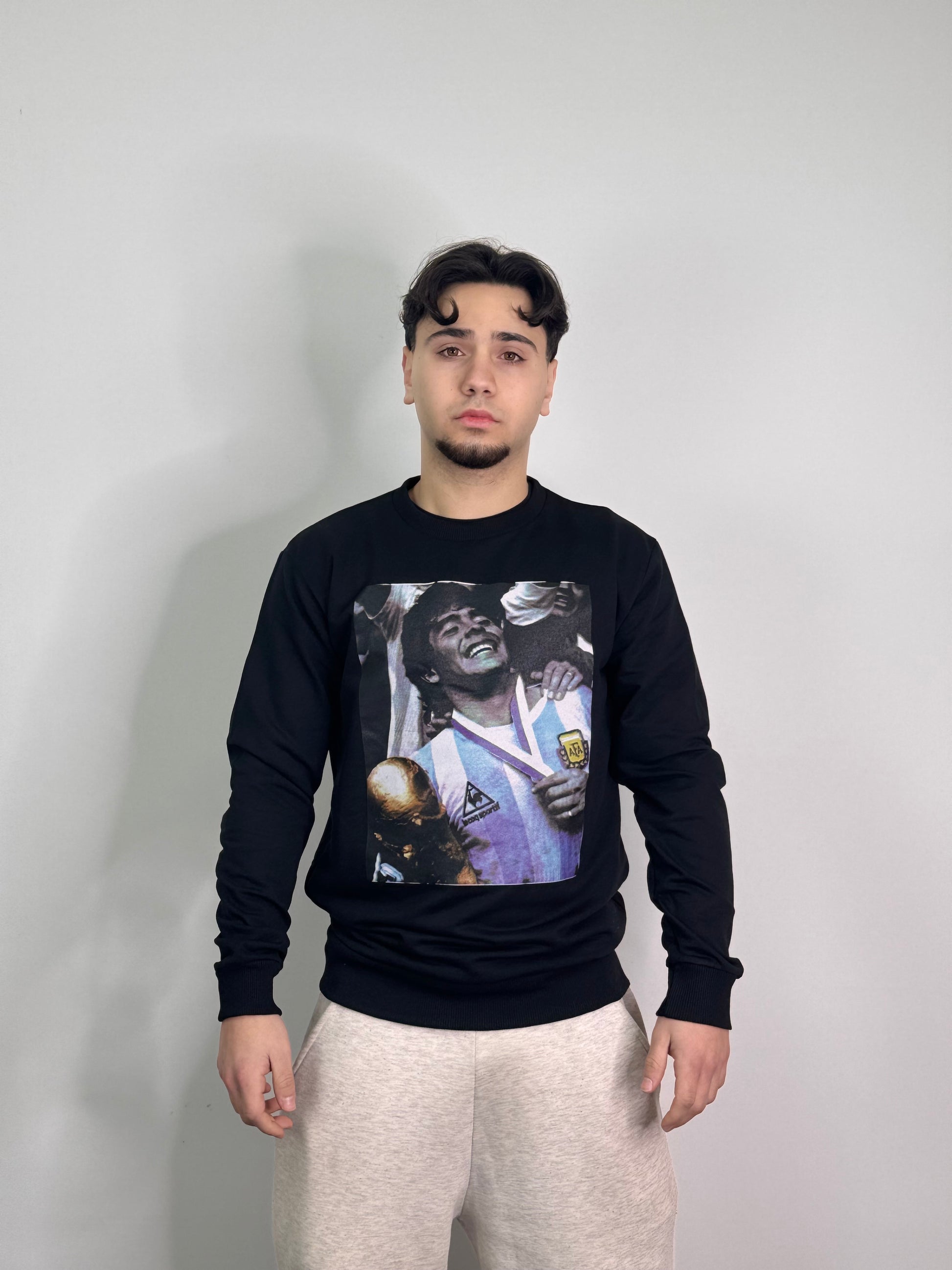 Felpa in cotone premium che celebra l'eredità calcistica di Diego Armando Maradona. Realizzata con tessuto morbido e resistente, questa felpa unisce comfort quotidiano a un design che rende omaggio a uno dei più grandi calciatori di tutti i tempi. Perfetta per gli appassionati di calcio che desiderano indossare un pezzo di storia dello sport. Ideale sia per il tempo libero che per occasioni casual, garantisce qualità costruttiva e un'estetica senza tempo.